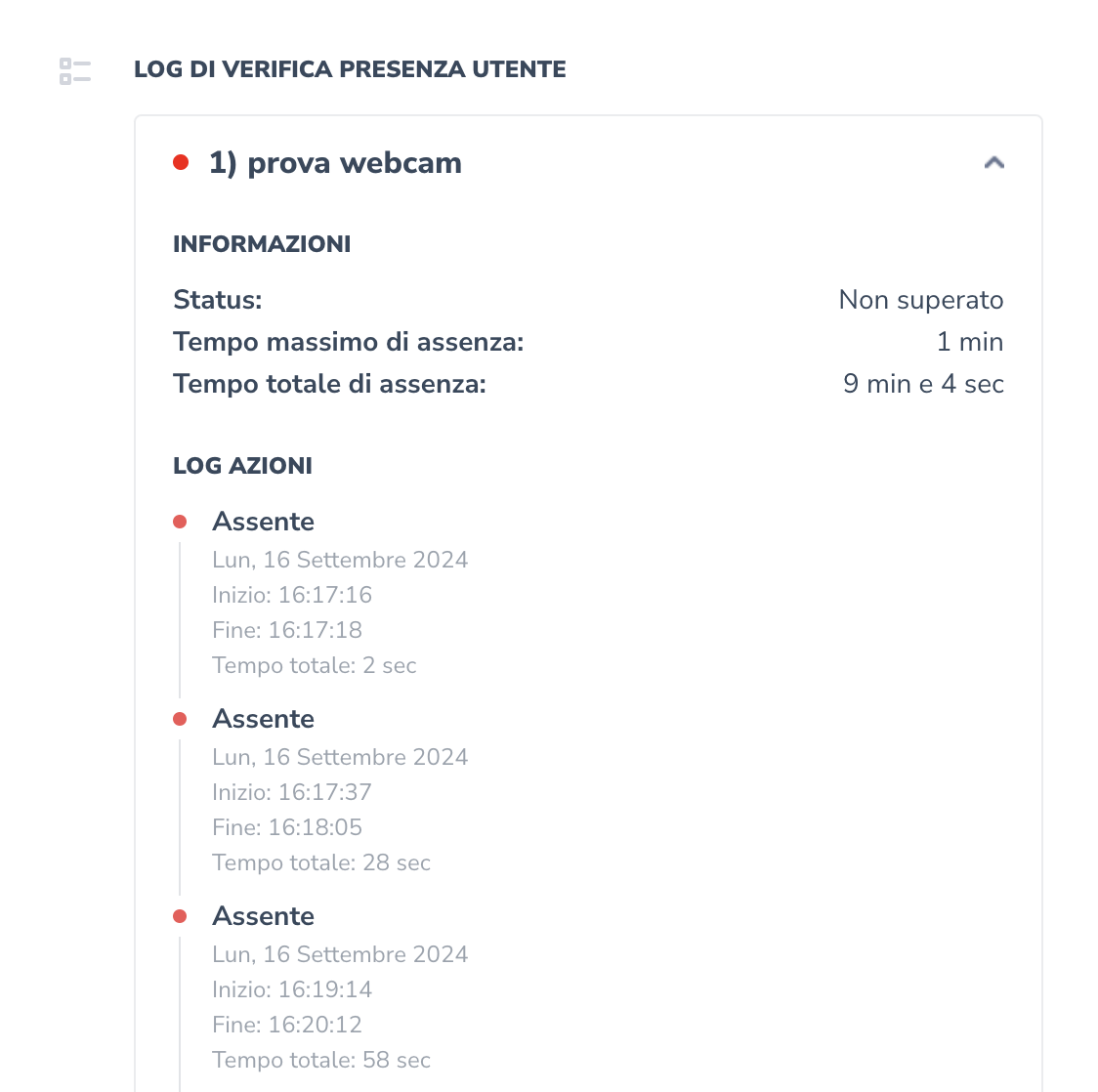 Cosa vuol dire log cumulativi? Sono la somma di tutte le rilevazioni del movimento fuori inquadratura del discente. Ciò vuol dire che, se il tempo massimo di assenza impostato è 1 minuto, al fine di analizzare la presenza o meno su quella specifica lezione, verranno sommati tutti i secondi che il partecipante ha passato fuori inquadratura.&#x20;