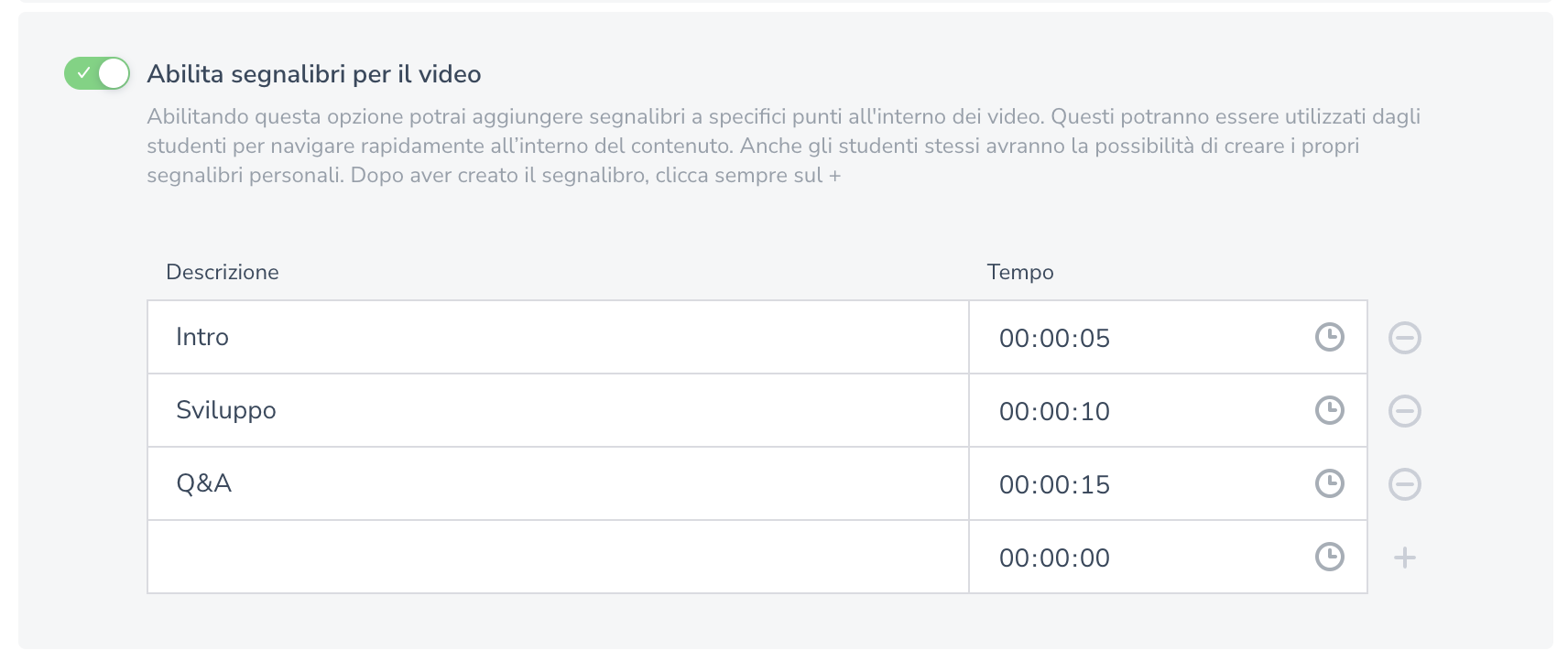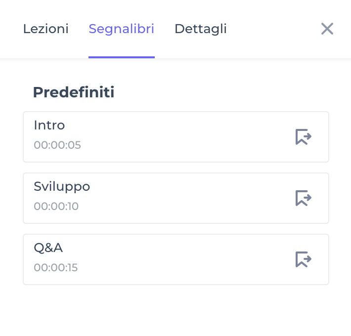 Puoi aggiungere dei segnalibri ai contenuti video per supportare gli studenti durante la fruizione del corso. Dovrai inserire una descrizione chiara e coincisa del segnalibro, la quale verrà visualizzata dagli studenti per guidarli nel ritrovare i punti chiave del video, e il minutaggio in cui esso apparirà.